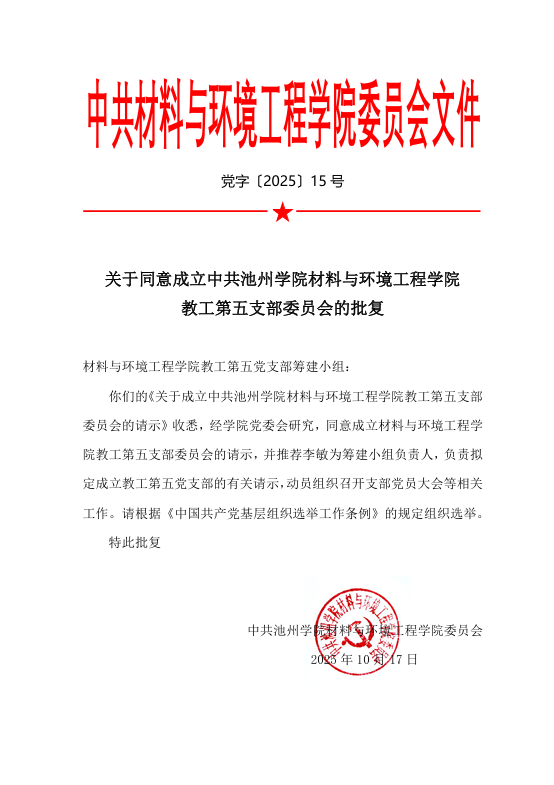 关于同意成立中共池州学院材料与环境工程学院教工第五支部委员会的批复