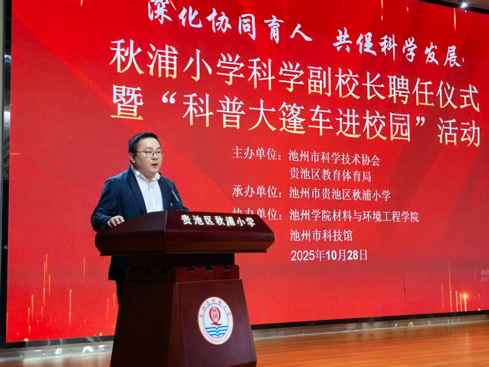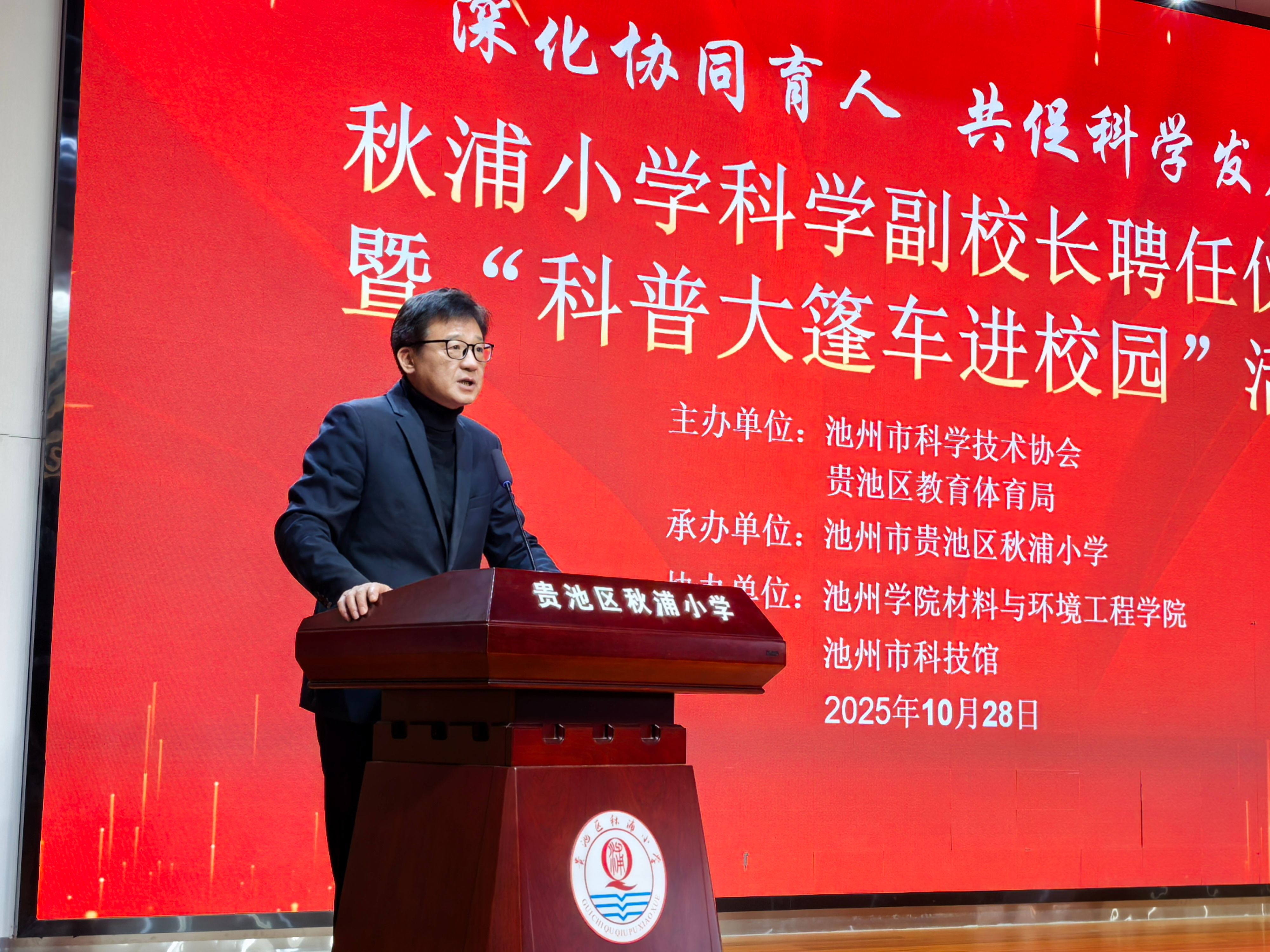 10月28日,池州市贵池区秋浦小学“科学副校长”聘任仪式暨“科普大篷车进校园”活动在秋浦小学多功能报告厅成功举行。池州市科学技术协会主席徐启明、池州市科技馆馆长汪琴、秋浦小学校长钱七二、池州学院材料与环境工程学院副院长肖新乐,以及两校师生代表出席本次活动,活动由秋浦小学副校长陆正华主持。