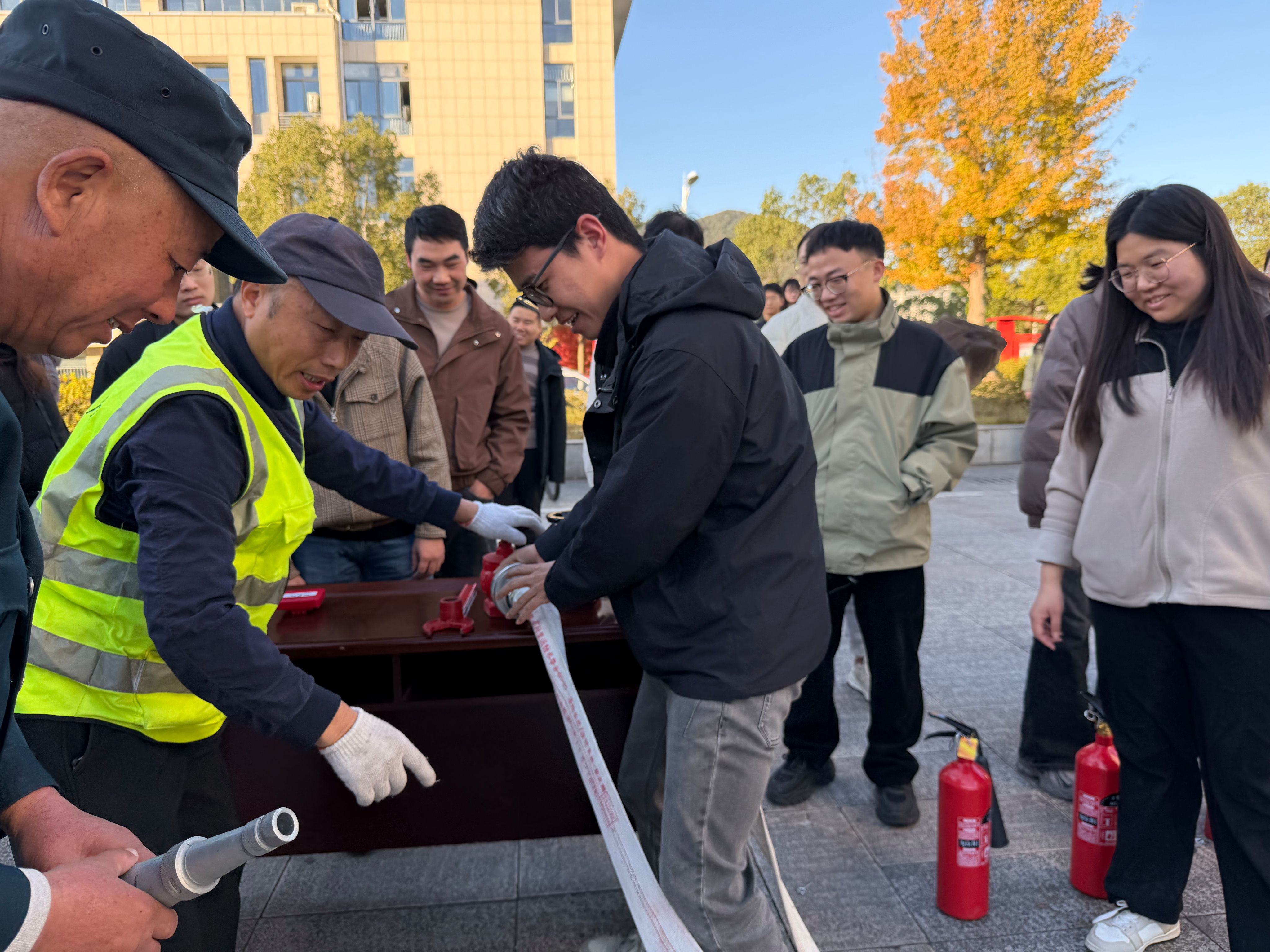 演练过程中,专业人员现场演示并详细讲解了灭火器与消防水带的正确使用方法。在讲解结束后,各位教师按照操作要领进行灭火器使用及消防水带连接的实操练习,进一步巩固所学技能,提升实战能力。