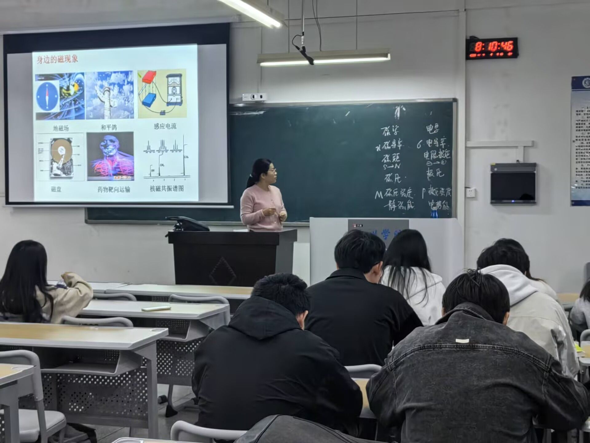 王守玲老师讲授的内容为“材料的磁学性能”。课程开场从学生已掌握的电学性能(电导率、极化、电偶极矩)等知识点出发,通过类比推理(磁导率、磁化、磁偶极矩)相关概念,自然、流畅地引入磁学性能这一新主题。在教学过程中,引用南宋民族英雄文天祥“臣心一片磁针石,不指南方不肯休”的著名诗句,不仅瞬间吸引了学生的注意力,更将科学现象(指南针指南)与家国情怀、人文精神巧妙结合,实现了课程思政的有机渗透,提升了课堂的文化内涵和情感温度。通过引导学生思考指南针原理、介绍地磁场、列举动物(如候鸟)及人类对磁场的多种利用实例,生动地阐明了学习磁学性能的现实意义和应用前景,有效激发了学生的内在学习动机。通过本节课的学习,学生成功实现了从电学知识到磁学知识的正向迁移,对磁学性能的研究背景、基本概念(磁性起源、材料分类、静磁能)有了初步而系统的认识,并为后续深入学习奠定了坚实的基础。